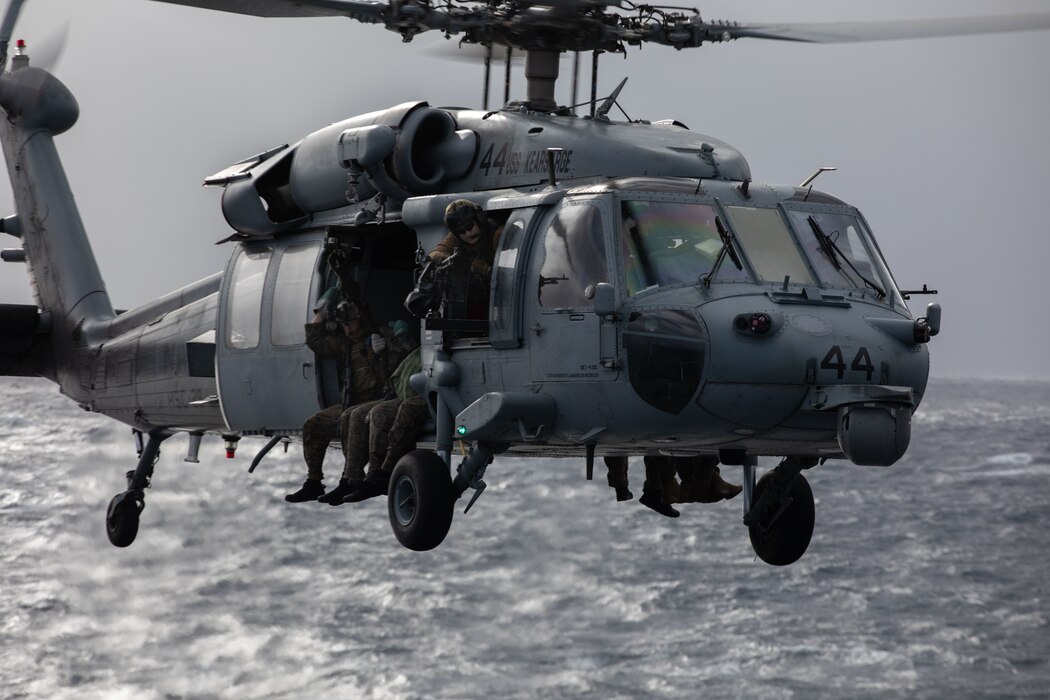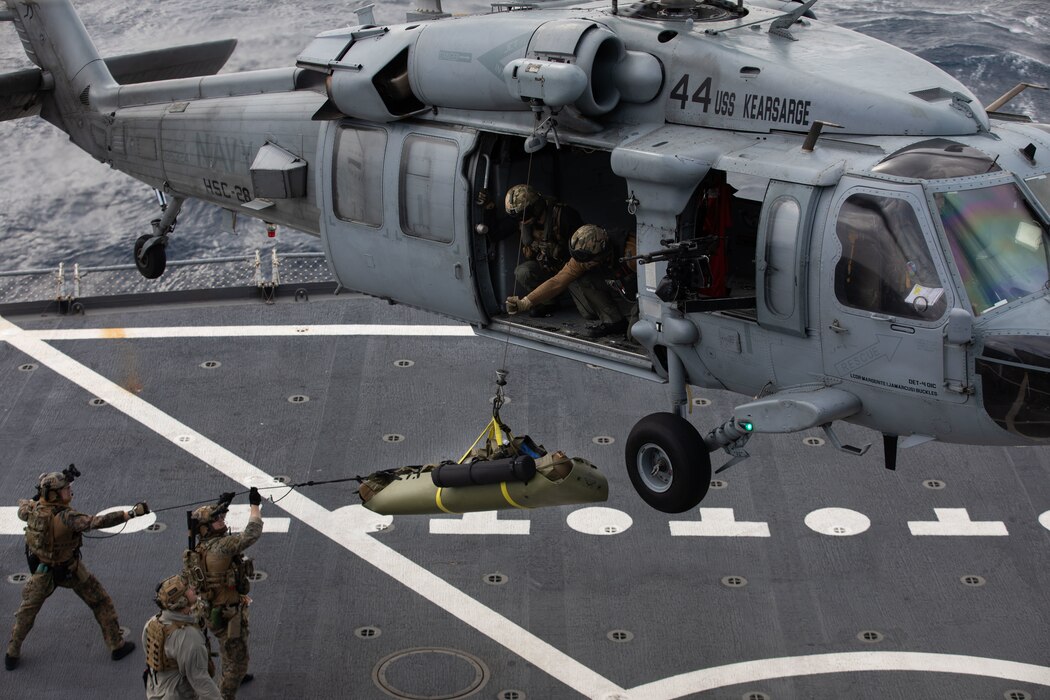 A U.S. Navy MH-60S Sea Hawk, assigned to Helicopter Sea Combat Squadron (HSC) 26, collects supplies from Military Sealift Command Henry J....