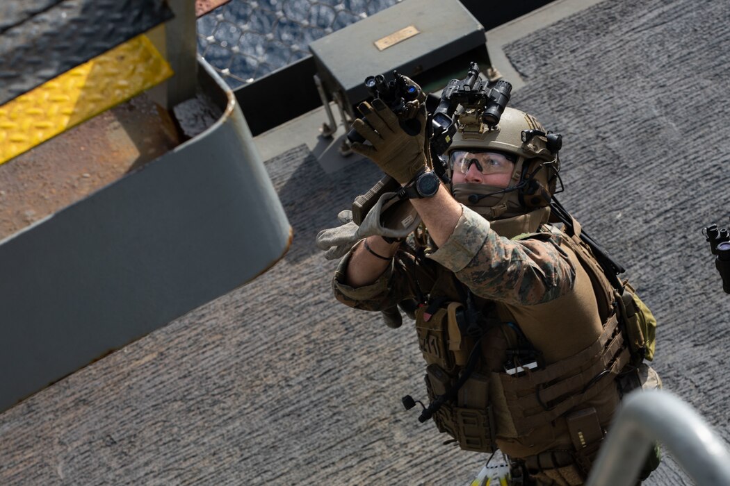 U.S. Marine Corps riflemen with Lima Company, Battalion Landing Team 3/6, 22nd Marine Expeditionary Unit (Special Operations Capable), monitor Skydio...