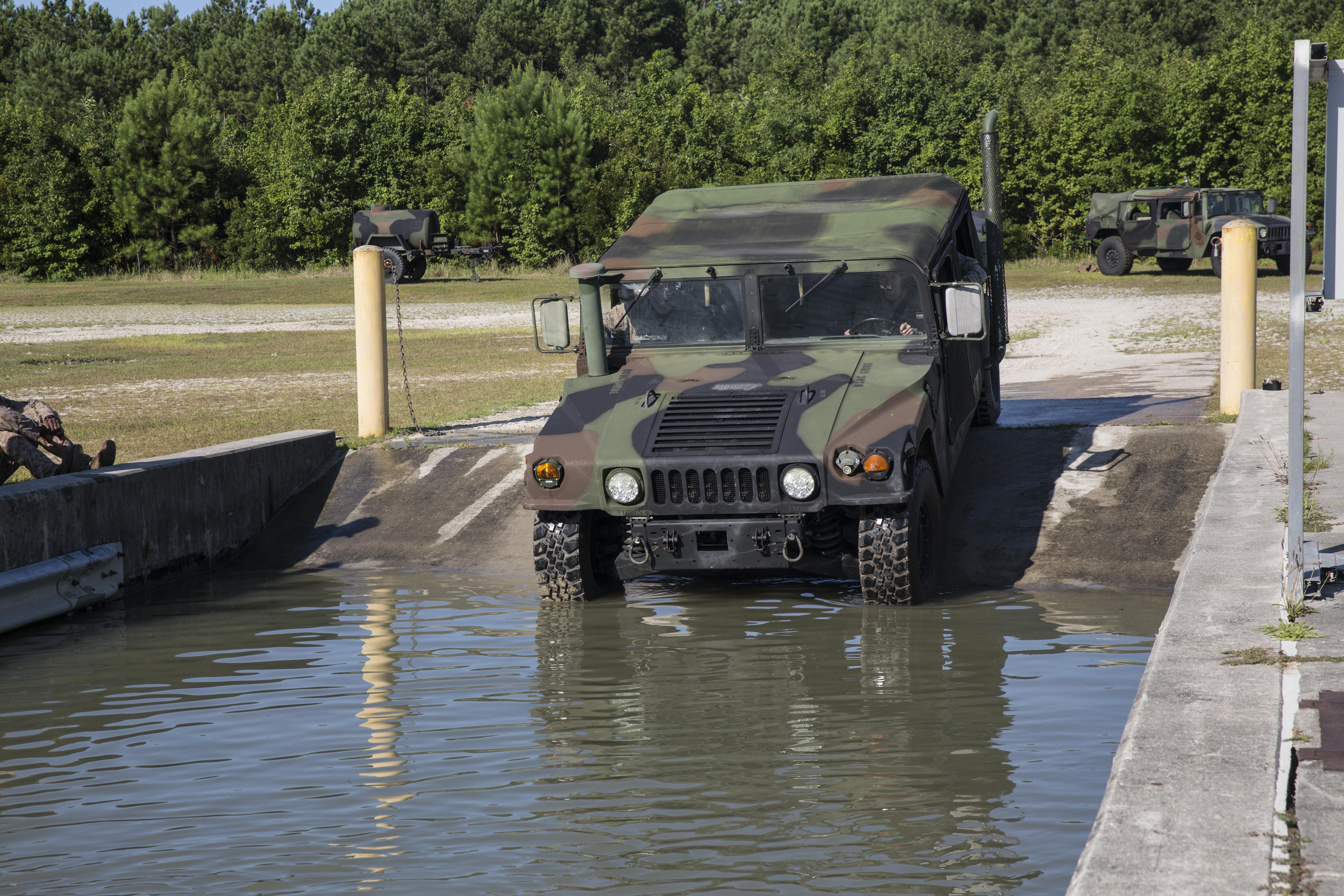 Marines with Marine Wing Support Squadron 272 drive a Humvee into a water-filled fording pit aboard Camp Johnson, N.C., July 28, 2015. As part of their training, Marines gained experience in ensuring unit readiness by maneuvering through the obstacle as their vehicle fills with water. (U.S. Marine Corps photo by Lance Cpl. Aaron K. Fiala/Released)