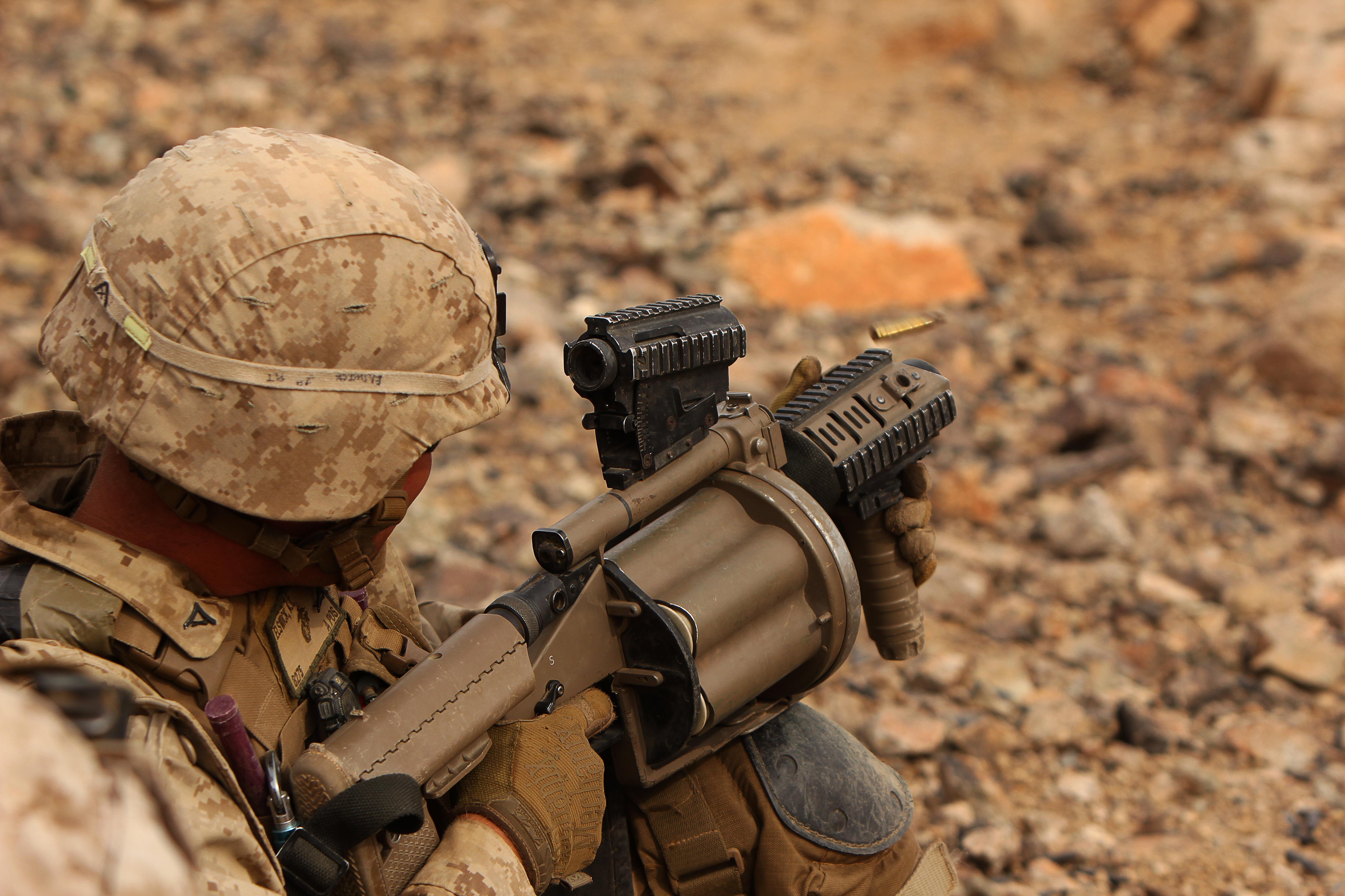 Lance Cpl. Anderson Elswick fires his M32A1 40mm Multi-Shot Grenade Launcher at a simulated enemy target at Range 400 at Marine Air-Ground Combat Center Twenty-nine Palms, Calif., Oct. 21, 2016. The M32A1 is capable of firing 40mm grenades at ranges up to approximately 400 yards. Elswick is a grenadier with 1st Battalion, 2nd Marine Regiment, 2nd Marine Division. (U.S Marine Corps photo by Lance Cpl. Juan A. Soto-Delgado)
