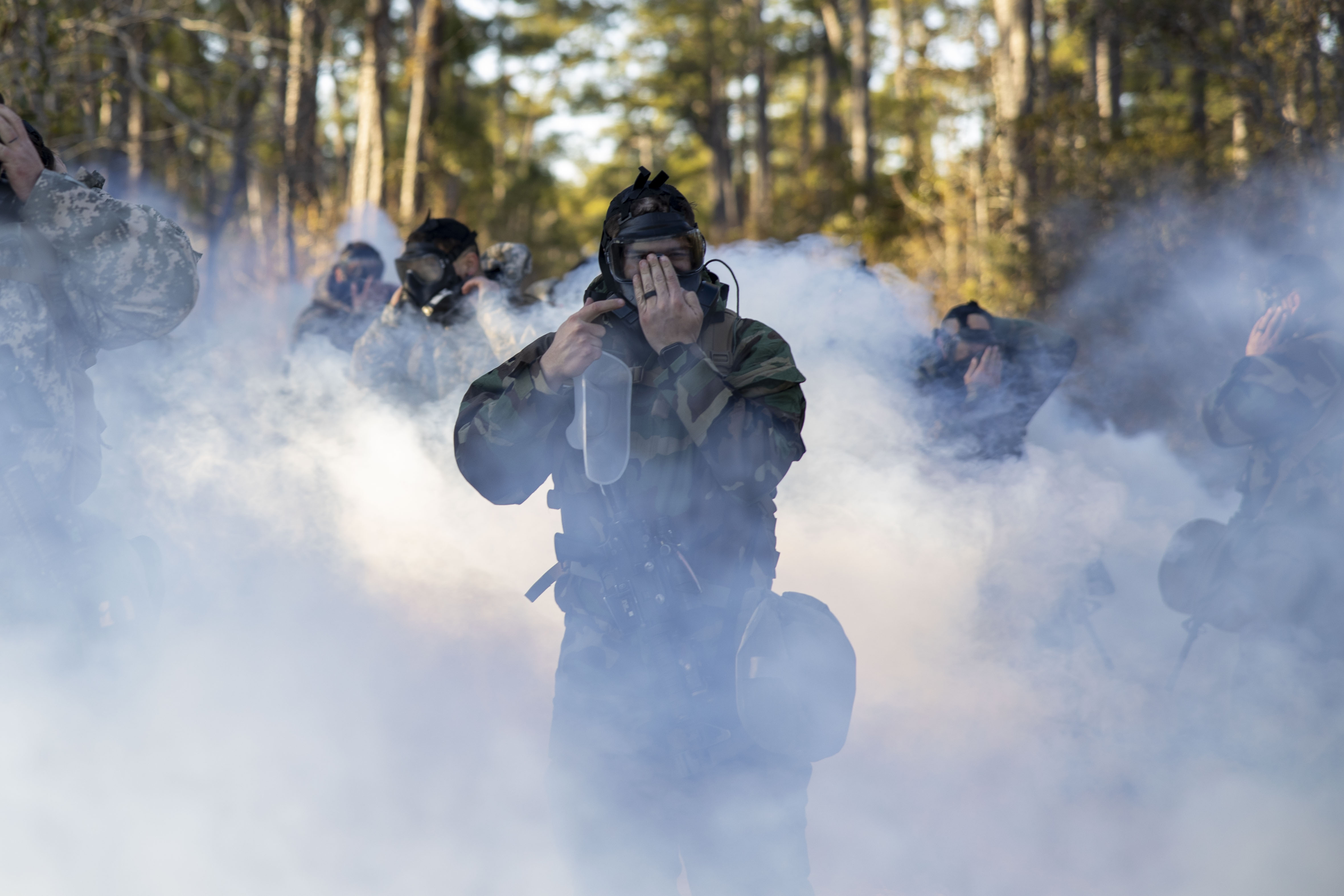 U.S. Marines with II Marine Expeditionary Force Support Battalion, II MEF Information Group, walk through chlorobenylidene malononitrile during a battalion field exercise at Marine Corps Base Camp Lejeune, North Carolina, Jan. 8, 2025. The battalion FEX was designed to increase proficiency in individual and crew-served marksmanship, basic combat skills and improve chemical, biological, radiological, and nuclear readiness. (U.S. Marine Corps photo by Sgt. Jacquilyn Davis)
